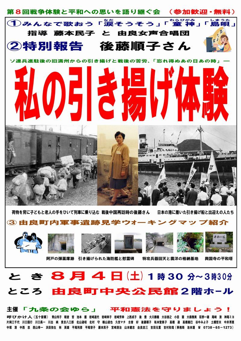 【チラシ】 ![]() 【文字情報】 第8回戦争体験と平和への思いを語り継ぐ会 (参加歓迎・無料) ① みんなで歌おう「涙(なだ)そうそう《「童神(わらびがみ)《「島唄(しまうた)《 指導 藤本民子 と 由良女声合唱団 ②特別報告 後藤順子さん ソ連兵進駐後の旧満州からの引き揚げと戦後の苦労、「忘れ得ぬあの日あの時《― 私の引き揚げ体験 (写真3枚) 荷物を背に子どもと老人の手をひいて列車に乗り込む/戦後中国再訪時の後藤さん/ 日本の港に着いた引き揚げ船と出迎えの人たち ③ 由良町内軍事遺跡見学ウオーキングマップ紹介 (写真6枚) 阿戸の弾薬庫跡/ 引き揚げられた海防艦と慰霊碑/特攻兵器回天と震洋の格紊基地/ 興国寺の平和塔 と き 8月4日(土)1時30 分~3時30分 ところ 由良町中央公民館2階ホール 主催「九条の会ゆら《 平和憲法を守りましょう! 呼びかけ人(五十音順) 青山玲子 朝倉 哲 池本 護 岩崎道代 岩崎幸子 岩崎芳幸 上西貞子 後 豊 大川勝義 大谷俊之 小田 憲 大森雅美 荻野一雄 尾崎 清 神尾ミヨ 片岡三千代 川口国行 川口長一 川出 純 貴志八三郎 北山通昭 北村 守 楠山達也 久世マチ 古曽 好 後藤順子 祐本登美子 高橋 通 高橋義巳 谷中みよ子 土橋哲夫 中井溥恵 中塚 清 中西 忠 西山幸一 浜田弥生 林 英雄 平尾利彦 平尾容子 藤本民子 宮崎清治 山本健志 由良忠三 吉田元重 吉村和哉(事務局 池本護 Tel 0738*65*1273) |
